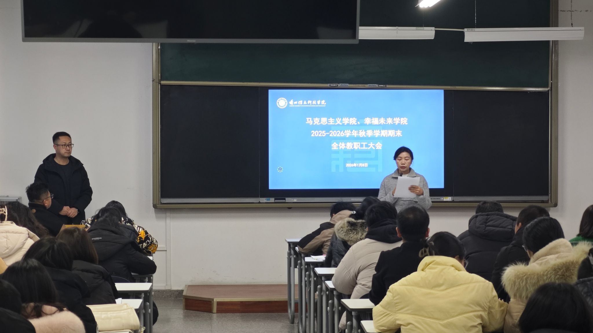 2026年1月8日,马克思主义学院、幸福未来学院在2号教学楼314教室召开2025学年秋季学期期末全体教职工会议,会议由院长张喆主持,两院全体教职工参会。会议首先由两个学院各教研室主任对本学期教研室工作进行汇报。之后张喆进行总结,他指出,学院在上半年的教学工作、科研成果、教师教学比赛等方面经过大家的努力都取得了出色的成绩。同时对于假期前相关工作,如成绩上报、成绩单打印、目标任务过程管理等相关工作进行了部署,...